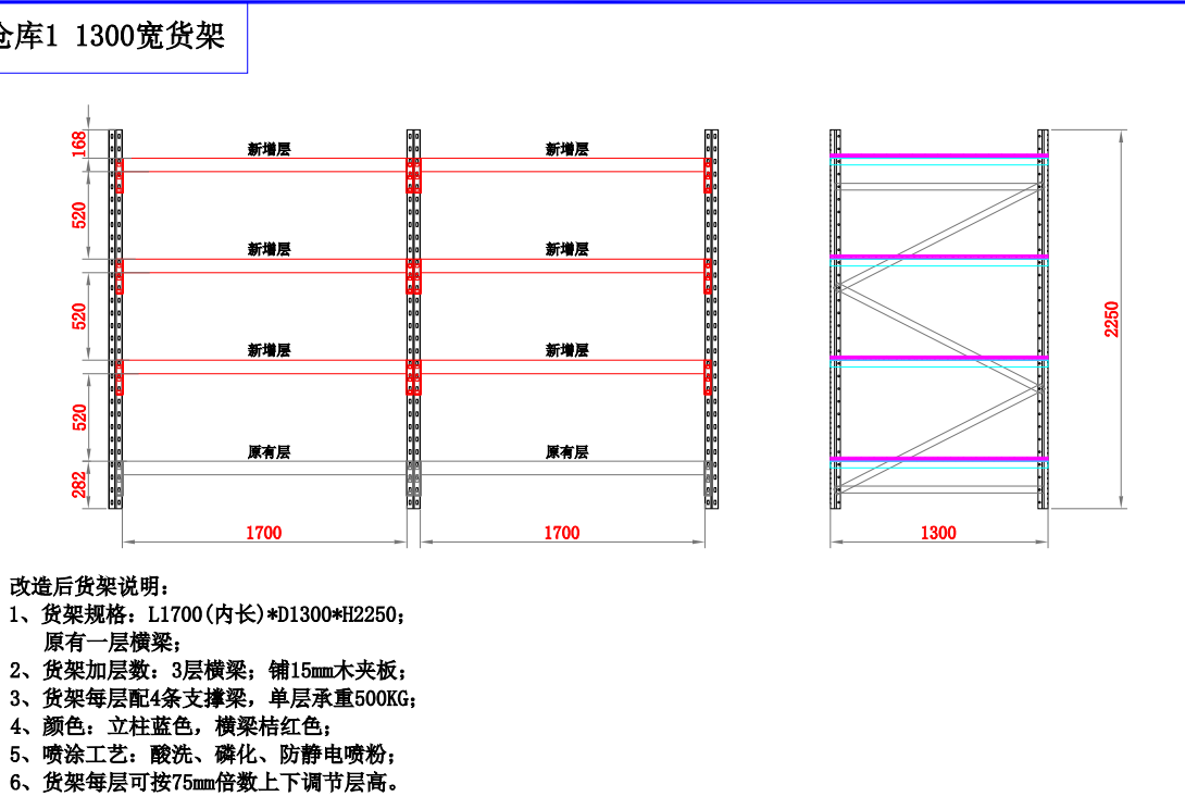 首先當我們預留空間時,我們需要考慮很多因素。其中之一是貨架每層的高度。通常是根據貨物的高度來設計的??紤]到整個貨架的安全性,我們會根據貨物的高度留出更多的空間,這部分空間就是安全空間。因為如果儲物架的高度與貨物的高度相同,叉車將非常不方便取貨。它可能會與貨架碰撞和摩擦。如果你留出一定的空間,這個問題就可以解決.定制貨架尺寸為:長1700*寬1300*高2250 數量:4套 原有一層橫梁 2、貨架加層數:3層 鋪15mm木夾板 貨架每層配4條支撐梁,單層承重500KG 每層可按75mm調節高度
