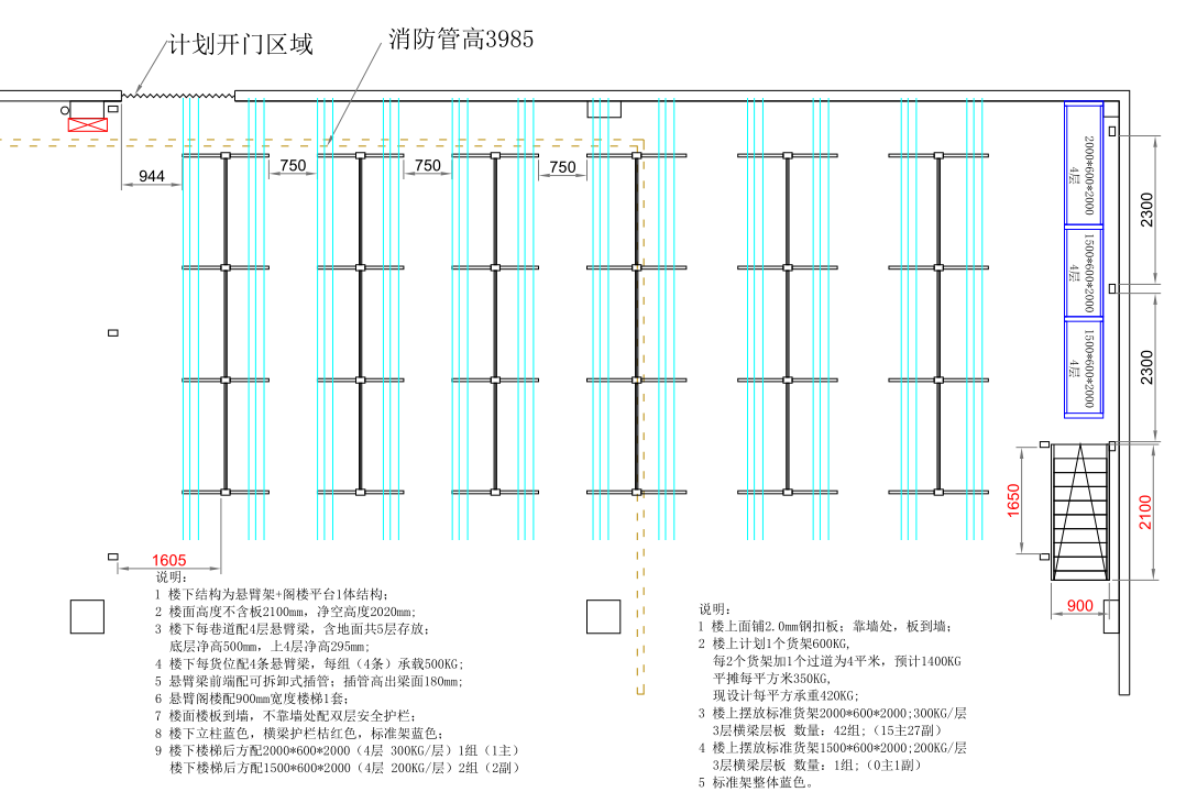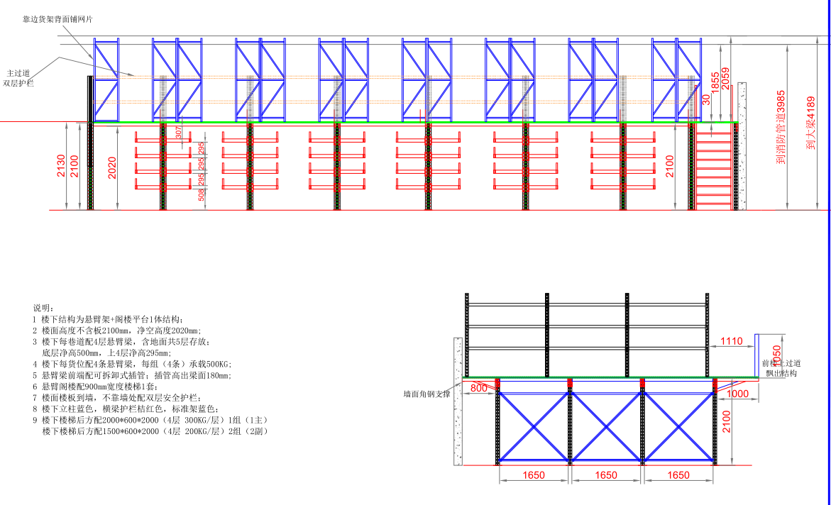 3、樓下每巷道配4層懸臂梁,含地面共5層存放 底層凈高500mm,上4層高295mm